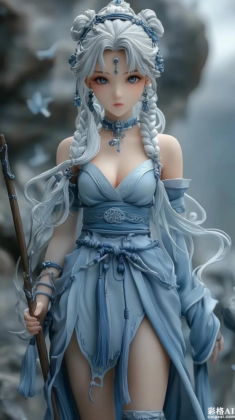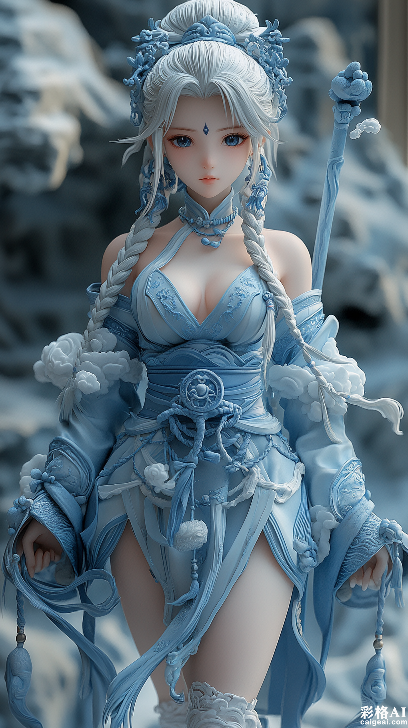 figure statue, 1girl, standing pose, full body shot, detailed proportions, Genshin Impact official art style, cryo vision bearer, Liyue character, detailed anime face, white braided hair, blue ornaments, serene eyes, calm expression, ethereal combat stance, elegant spear pose, taoist dress, modest design, cloud crane patterns, flowing silk ribbons, ethereal fabric details, traditional ornaments, refined boots, cryo element effects, frost sparkles, cloud wisps, magical energy flow, floating ice crystals, mountain landscape elements, misty background, cool lighting, white and blue color scheme