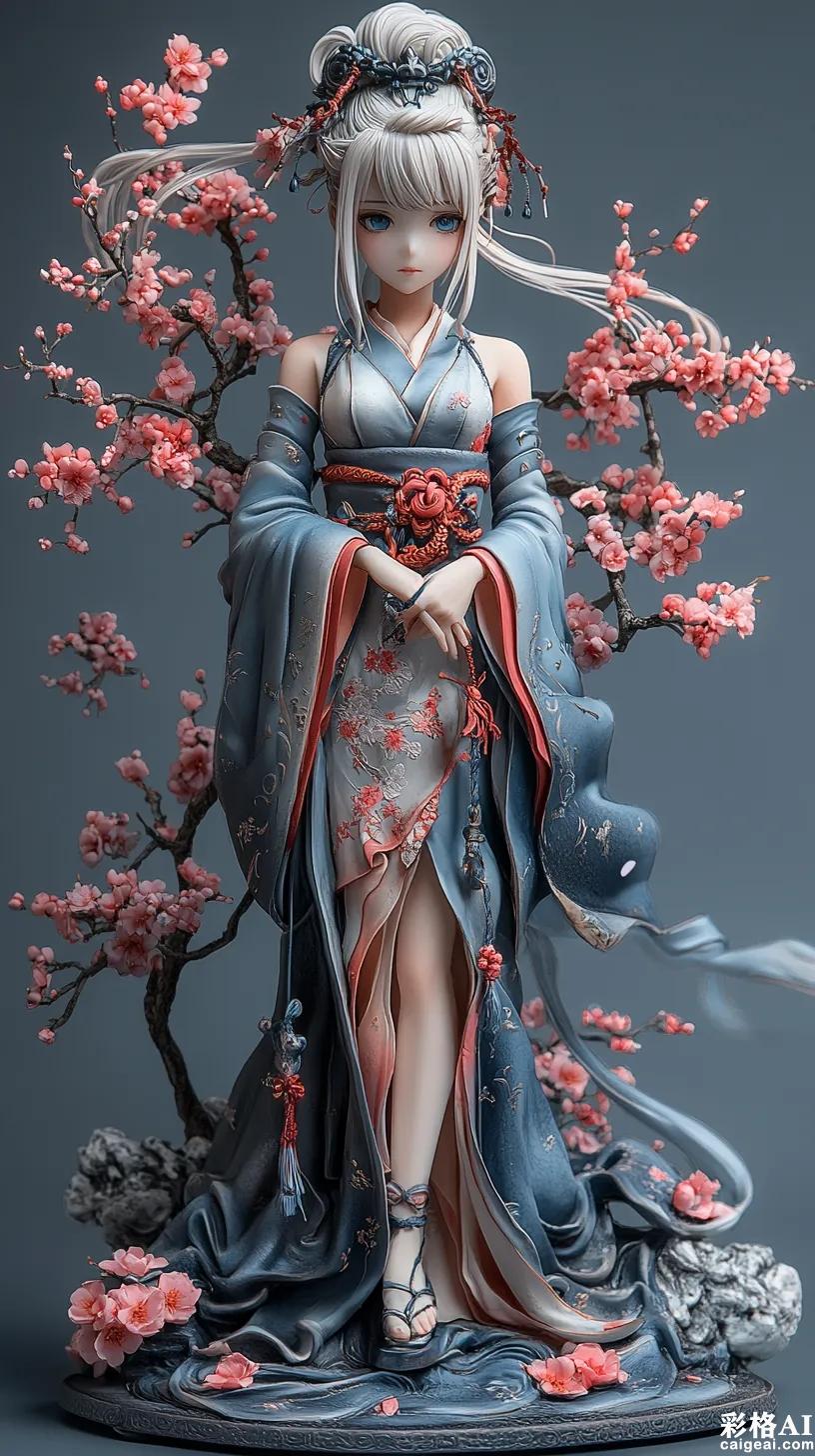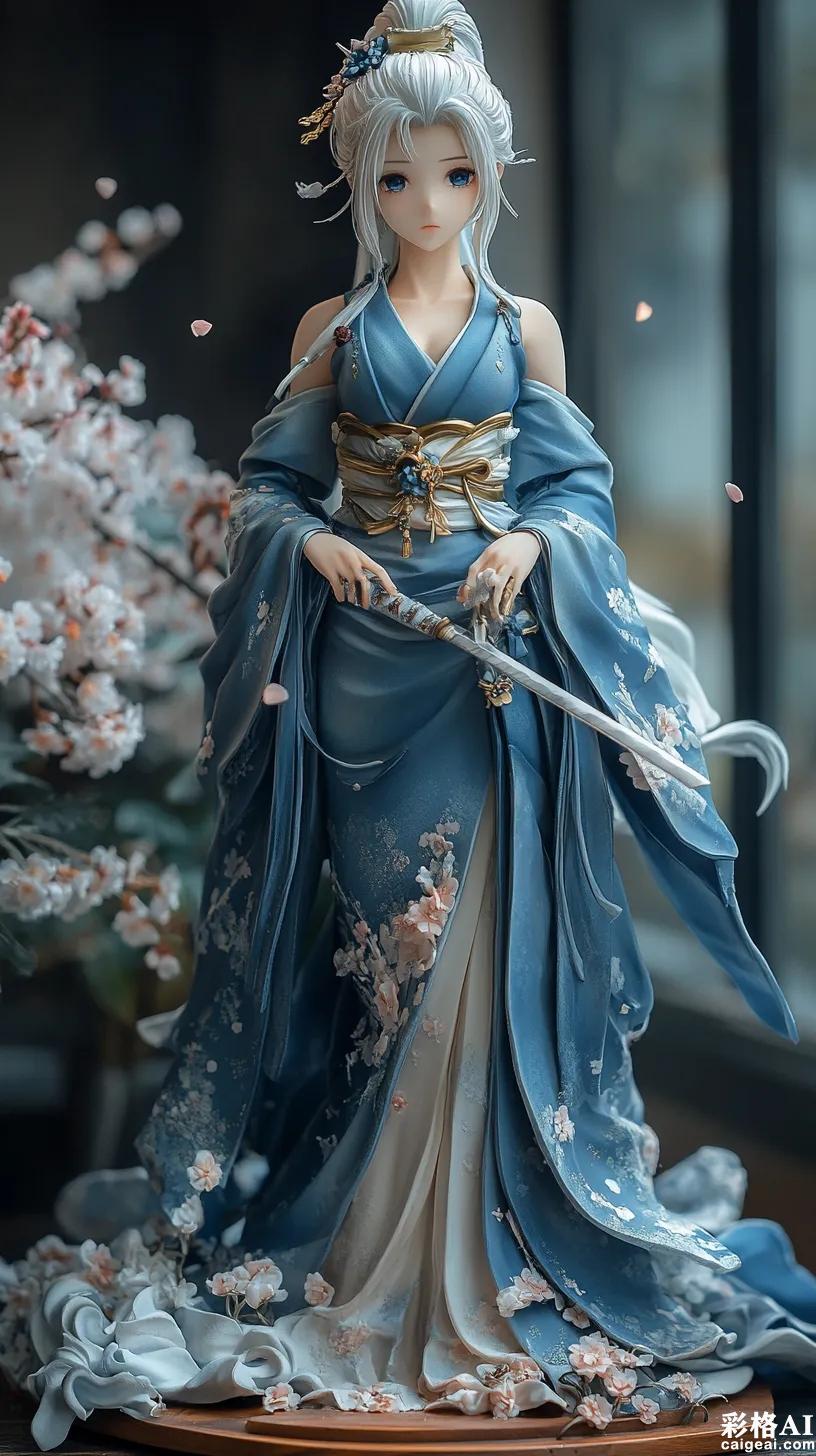 figure statue, 1girl, standing pose, full body shot, detailed proportions, Genshin Impact official art style, cryo vision bearer, Inazuma character, detailed anime face, white straight hair, sakura ornaments, blue eyes, noble expression, elegant sword stance, katana drawing pose, elegant kimono dress, modest japanese design, sakura patterns, flowing silk fabric, ice crystal details, traditional ornaments, japanese boots, cryo element effects, frost sparkles, sakura petals, magical energy flow, floating snow crystals, japanese garden elements, cherry blossom background, cool lighting, white and blue color scheme