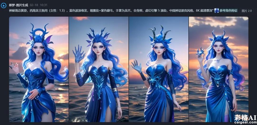 提示词1:神秘海边黄昏,西海龙王敖闰(女性:1.3),蓝色波浪卷发,烟熏妆+紫色睫毛,手掌为龙爪,全身照,虚幻引擎 5 渲染,中国神话朋克风格,8K 超清景深