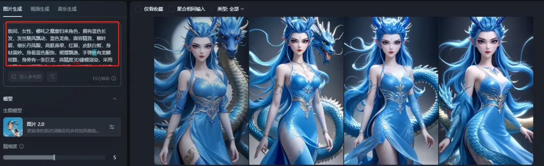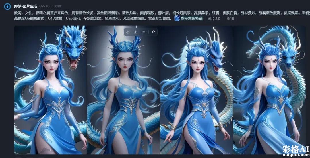 提示词2:敖闰,女性,哪吒之魔童归来角色,拥有蓝色长发,发丝随风飘动,蓝色龙角,面容精致,柳叶眉,细长丹凤眼,高挺鼻梁,红唇,皮肤白皙,身材曼妙。身着蓝色服饰,裙摆飘逸,手臂处有龙鳞纹路,身旁有一条巨龙,高精度3D建模渲染,采用高精度CG插画形式,C4D建模,UE5渲染,辛烷值渲染,色彩柔和,光影效果细腻,营造梦幻氛围。