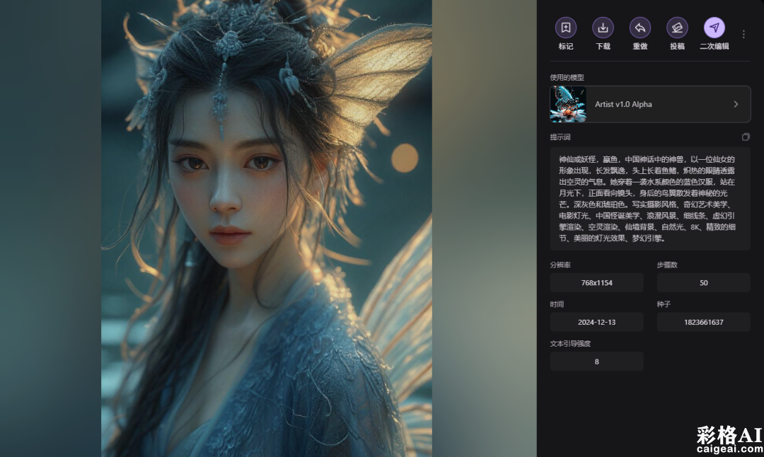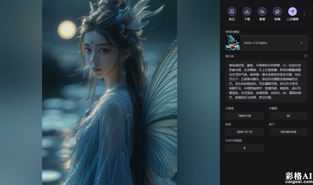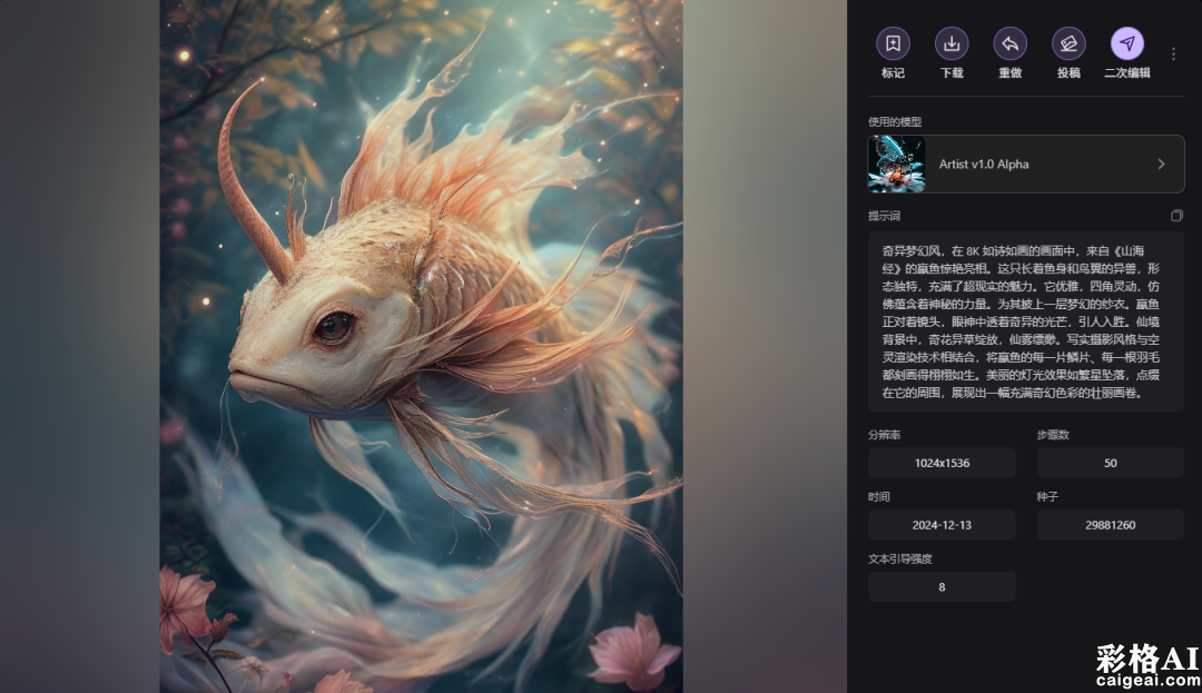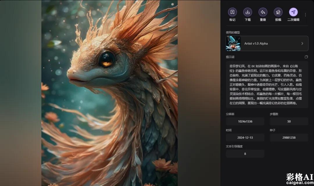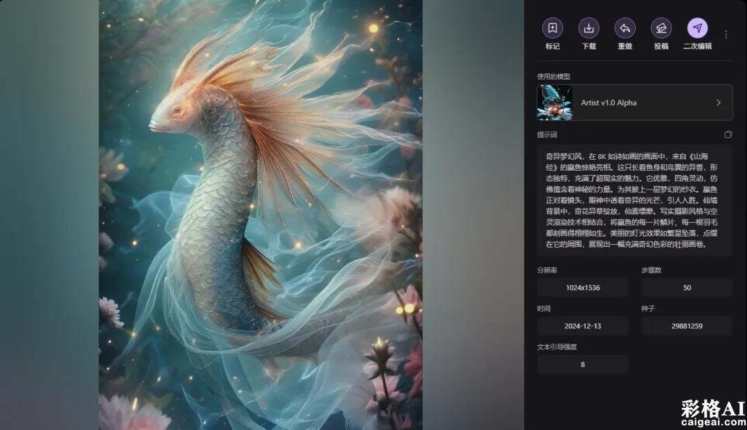 奇异梦幻风,在 8K 如诗如画的画面中,来自《山海经》的蠃鱼惊艳亮相。这只长着鱼身和鸟翼的异兽,形态独特,充满了超现实的魅力。它优雅,四角灵动,仿佛蕴含着神秘的力量。为其披上一层梦幻的纱衣。蠃鱼正对着镜头,眼神中透着奇异的光芒,引人入胜。仙境背景中,奇花异草绽放,仙雾缥缈。写实摄影风格与空灵渲染技术相结合,将蠃鱼的每一片鳞片、每一根羽毛都刻画得栩栩如生。美丽的灯光效果如繁星坠落,点缀在它的周围,展现出一幅充满奇幻色彩的壮丽画卷。